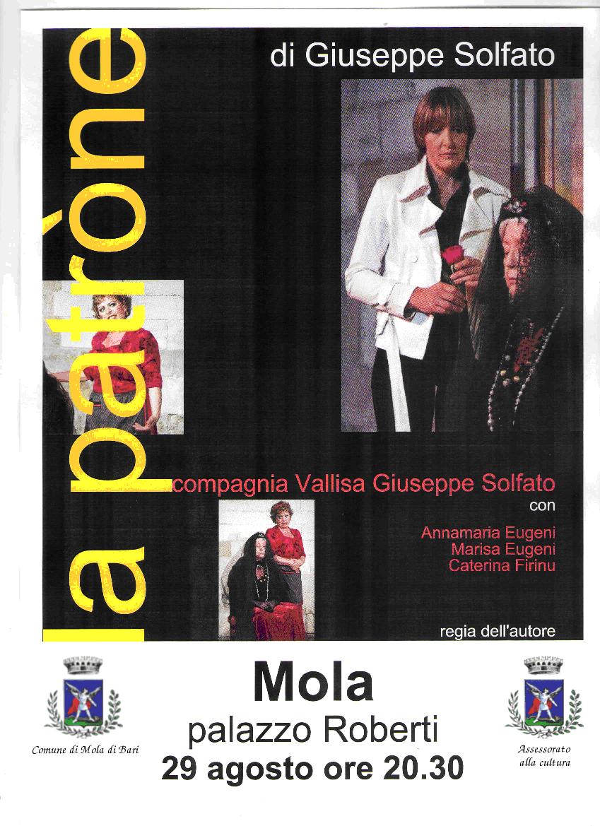 Una scrittura scorrevole, sapientemente calibrata in un atto tragicomico nelle antitesi fra registri dialettali e lingua italiana. Interpretazioni pariteticamente esaltanti, avversando la dilagante patina di prevedibilità, cliché e Essenzialità con funzionale attenzione registica alla “parola”, propedeutica a delineare molteplici piani, stati d’animo e tematiche eterogenee A distenza di anni dalla genesi, “La Patrone” di Giuseppe Solfato, rivela una disarmante attualità, soprattutto perché supportata “in itinere” da una fruizione “leggera” e di “spessore” in contemporanea conferendo a qualsiasi istanza capacità ontologica in relazione alle dinamiche quotidiane. con un cast ben variegato di primedonne: Annamaria e Marisa Eugeni e Caterina Firinu.